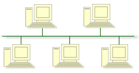 Esta topologia é bem comum e possui alto poder de expansão. Nela, todos os nós estão conectados a uma barra que é compartilhada entre todos os processadores, podendo o controle ser centralizado ou distribuído. O meio de transmissão usado nesta topologia é o cabo coaxial.